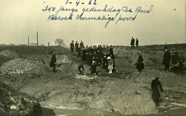 Ansichtkaart en foto, zwart/wit, gemaakt tijdens het 1 aprilfeest in 1922 te Brielle. De koninklijke familie bij het 1 april-monument, dat door Koningin Wilhelmina werd onthuld. Op de foto loopt koningin Wilhelmina door slijk en greppels om zelf te aanschouwen vanwaar de watergeuzen den Briel binnengekomen zijn. Bron: Streekarchief VPR.