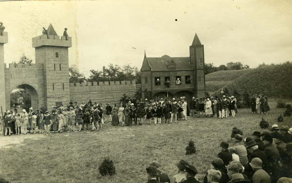 Ansichtkaart en foto, zwart/wit, gemaakt tijdens de opvoering van het openluchtspel Het Kind van Voorne ter gelegenheid van 600 jaar Brielse stadsrechten op 25 juli 1930. De spelers voor de nagebouwde stadspoort. Bron: Streekarchief VPR.