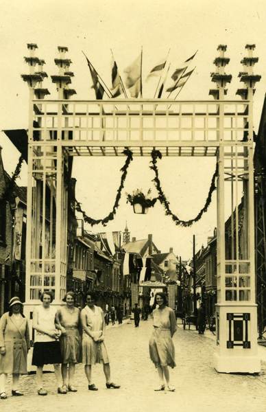 Ansichtkaart en foto, zwart/wit, gemaakt van de Langestraat tijdens de viering van 600 jaar Brielse stadsrechten in 1930.