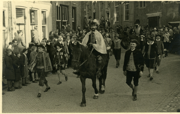Ansichtkaart en foto, zwart/wit, van het 1 aprilfeest in 1947 te Brielle. Foto van optocht door de Koopmanstraat richting de Langestraat.