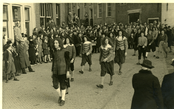 Ansichtkaart en foto, zwart/wit, van het 1 aprilfeest in 1947 te Brielle. Foto van optocht door de Koopmanstraat richting de Langestraat.