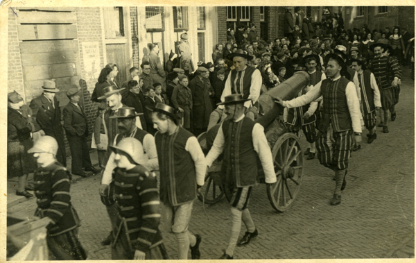 Ansichtkaart en foto, zwart/wit, van het 1 aprilfeest in 1947 te Brielle. Foto van optocht door de Koopmanstraat richting de Langestraat.
