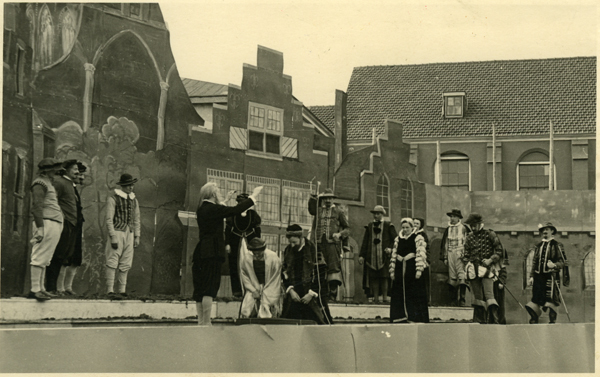 Ansichtkaart en foto, zwart/wit, van het 1 aprilfeest in 1947 te Brielle. Foto van spelers tijdens het opvoeren van het historisch toneelstuk.