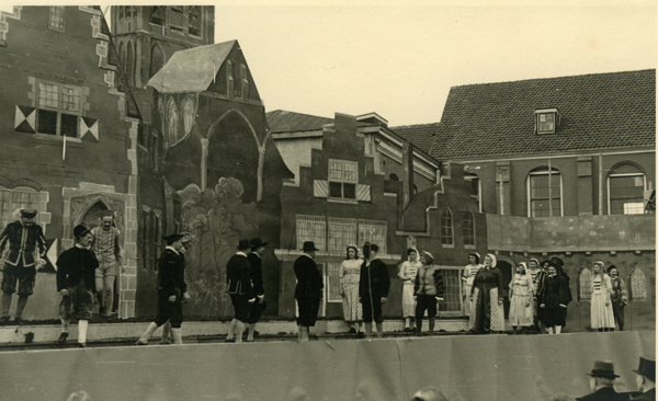 Ansichtkaart en foto, zwart/wit, van het 1 aprilfeest in 1947 te Brielle. Foto van spelers tijdens het opvoeren van het historisch toneelstuk.