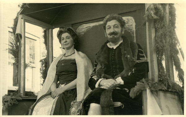 Ansichtkaart en foto, zwart/wit, van het 1 aprilfeest in 1947 te Brielle. Foto van deelnemers aan de historische optocht.
