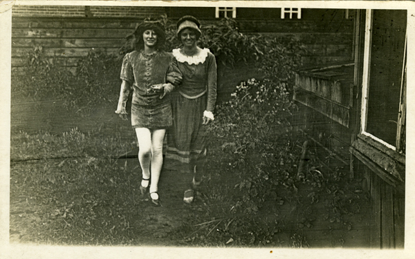Ansichtkaart en foto, zwart/wit, van twee vrouwen in een tuin.