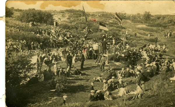 Ansichtkaart en foto, zwart/wit, van een bijeenkomst in de duinen.