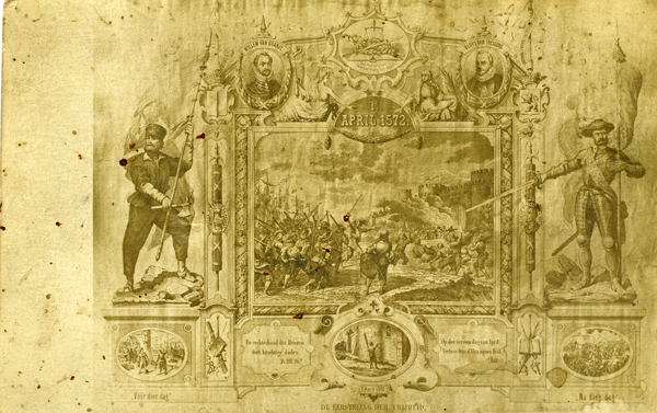 Ansichtkaart, sepia, naar een prent van de inname van Brielle 1 april 1572.
