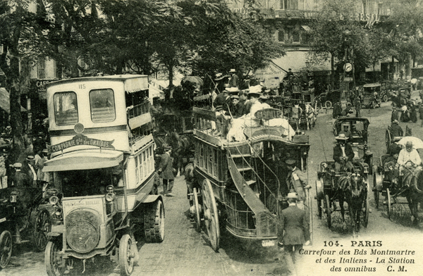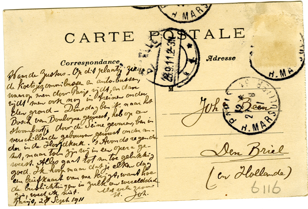 Ansichtkaart, zwart/wit, uit Parijs gericht aan Johan Been. Op de ansichtkaart zijn diverse koetsen en autobussen te zien. Opschrift in het Frans rechtsonder.