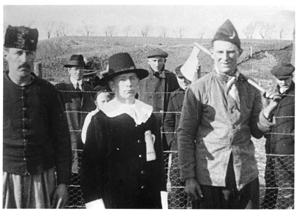 Foto, reproductie, zwart/wit, gemaakt tijdens het 1 aprilfeest in 1922 te Brielle. De herdenking van de inname van den Briel werd onder andere gevierd met het opvoeren van een historisch toneelstuk. Geuzen op de wallen. Foto met een wit kader.