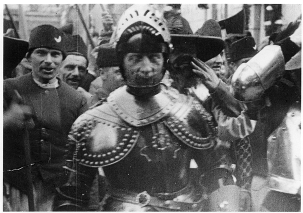 Foto, reproductie, zwart/wit, gemaakt tijdens het 1 aprilfeest in 1922 te Brielle. De herdenking van de inname van den Briel werd onder andere gevierd met het opvoeren van een historisch toneelstuk. Geuzen in aantocht. Foto met een wit kader.