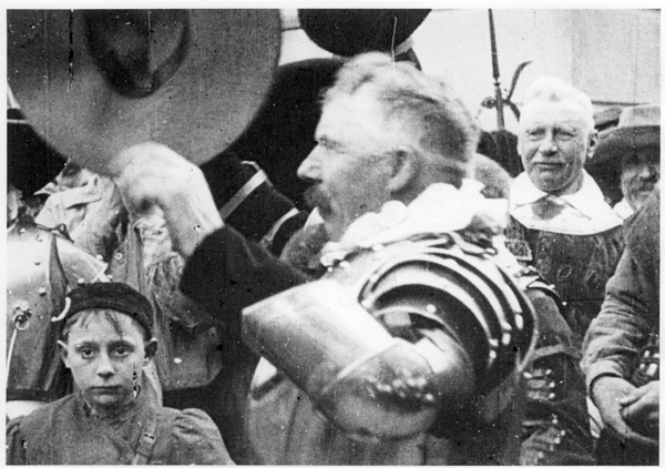 Foto, reproductie, zwart/wit, gemaakt tijdens het 1 aprilfeest in 1922 te Brielle. De herdenking van de inname van den Briel werd onder andere gevierd met het opvoeren van een historisch toneelstuk. Foto met een wit kader.