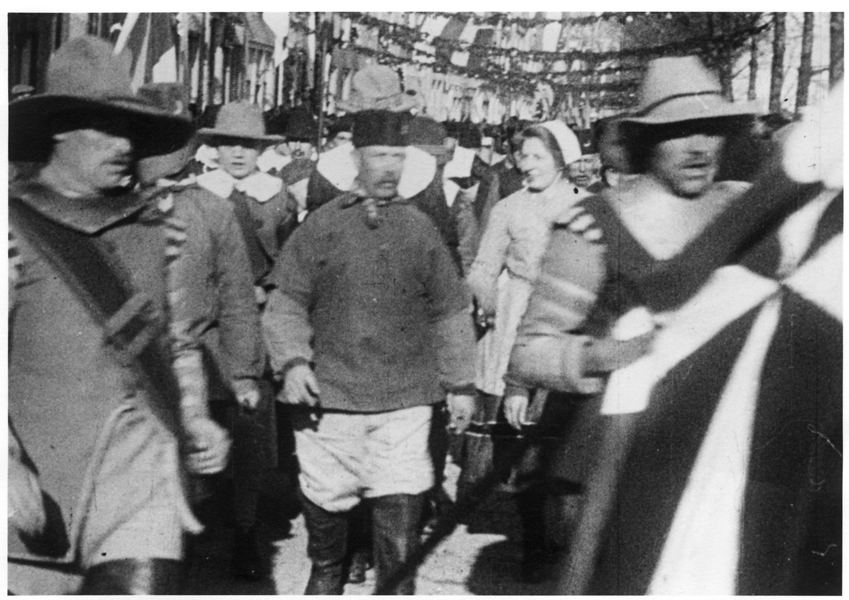 Foto, reproductie, zwart/wit, gemaakt tijdens het 1 aprilfeest in 1922 te Brielle. De herdenking van de inname van den Briel werd onder andere gevierd met het opvoeren van een historisch toneelstuk en een optocht. Foto met een wit kader.