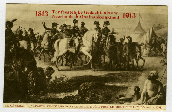 Ansichtkaart, zwart/wit, gemaakt ter gelegenheid van Nederlands onafhankelijkheid 1813-1913. Ansichtkaart met een historische afbeelding van Napoleon. Met een Frans opschrift: LE GÉNÉRAL BONAPARTE VISITE LES FONTAINES DE MOÖSE PRÈS LE MONT-SINAÏ (28 Décembre 1798). Opschrift in het rood.