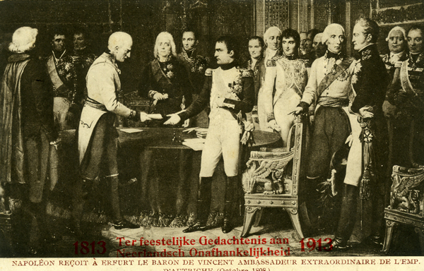 Ansichtkaart, zwart/wit, gemaakt ter gelegenheid van Nederlands onafhankelijkheid 1813-1913. Ansichtkaart met een historische afbeelding van Napoleon. Met een Frans opschrift: NAPOLÉON RECOIT À ERFURT LE BARON DE VINCENT AMBASSADEUR EXTRAORDINAIRE DE L'EMP. / D'AUTRICHE (Octobre 1808.) Opschrift in het rood.