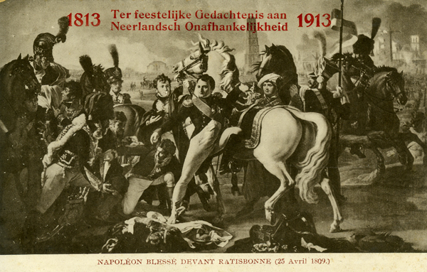 Ansichtkaart, zwart/wit, gemaakt ter gelegenheid van Nederlands onafhankelijkheid 1813-1913. Ansichtkaart met een historische afbeelding van Napoleon. Met een Frans opschrift:'NAPOLÉON BLESSÉ DEVANT RATISBONNE (25 Avril 1809.)'. Opschrift in het rood.