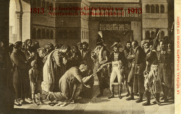 Ansichtkaart, zwart/wit, gemaakt ter gelegenheid van Nederlands onafhankelijkheid 1813-1913. Ansichtkaart met een historische afbeelding van Napoleon. Met opschrift: 'LE GÉNÉRAL BONAPARTE DONNE UN SABRE AU CHEF MILITAIRE D'ALEXANDRIE. (Juillet 1789)'. Opschrift in het rood.