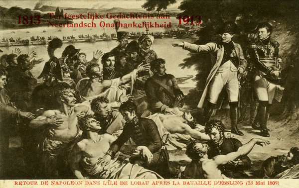 Ansichtkaart, zwart/wit, gemaakt ter gelegenheid van Nederlands onafhankelijkheid 1813-1913. Ansichtkaart met een historische afbeelding van Napoleon. Met opschrift: 'RETOUR DE NAPOLÉON DANS L'ÎLE DE LOBAU APRÈS LA BATAILLE D'ESSLING (23 Mai 1809)'. Opschrift in het rood.