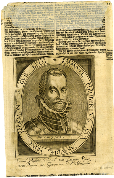 Prent, kopergravure met portret van Emanuel Philibert, hertog van Savoye, prins van Piemonte (1528-1580) in medaillon. Man heeft kort golvend haar, draagt een baard en snor. Hij heeft een harnas aan met daaronder een hoge witte kraag. Rondom medaillon een opschrift. Boven medaillon tekst uit een boek.