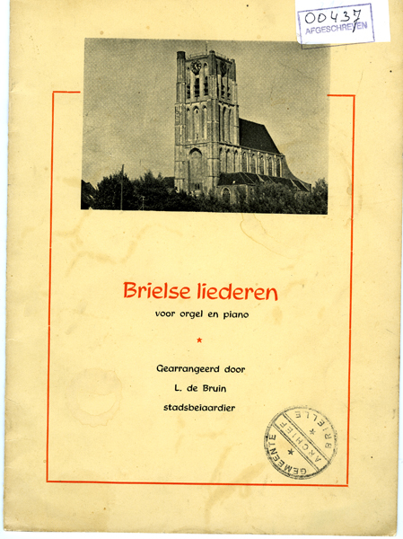 Liedboek, getiteld: 'Brielse liederen voor orgel en piano. Gearrangeerd door L. de Bruin stadsbeiaardier. Op de voorkant staat een afbeelding, zwart/wit, van de Sint Catharijnekerk en een stempel van het Gemeentearchief Brielle. Inhoud liederen: Ons Brieltje, Wit Rood Wit, Een liedje van Coppelstock, de Franse Commandant, De scheepsjongen en Lage Schoentjes. Meerdere liederen geschreven door ...