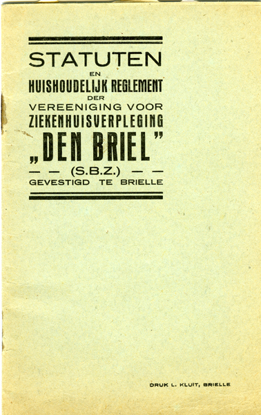 Document, getiteld: 'Statuten en Huishoudelijk reglement der Vereeniging voor ziekenhuisverpleging Den Briel'. Inhoud bestaat uit 38 artikelen.