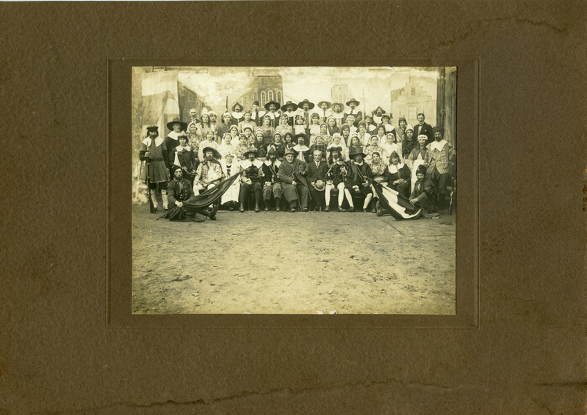 Foto, zwart/wit opgeplakt op bruin karton met groepsportret van de spelers van het 1 april spel, met Johan Been in 1922.