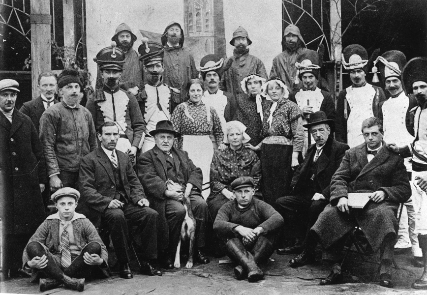 Foto, zwart/wit, van een groepsportret met Johan Been. Foto met spelers van een historiespel.