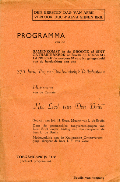 Programma van de samenkomst in de grote of Sint Catharijnekerk te Brielle op dinsdag 1 april 1947, ter gelegenheid van de herdenking van ons 375-jarig vrij en onafhankelijk volksbestaan. Uitvoering van de Cantate en met o.a. een gedicht van Johan. H. Been.
