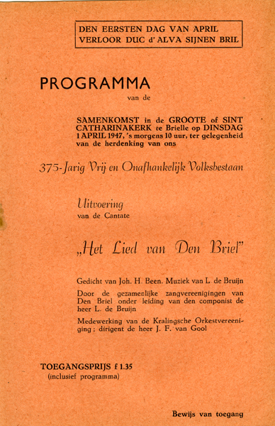 Programma van de samenkomst in de grote of Sint Catharijnekerk te Brielle op dinsdag 1 april 1947, ter gelegenheid van de herdenking van ons 375-jarig vrij en onafhankelijk volksbestaan. Uitvoering van de Cantate en met o.a. een gedicht van Johan. H. Been.