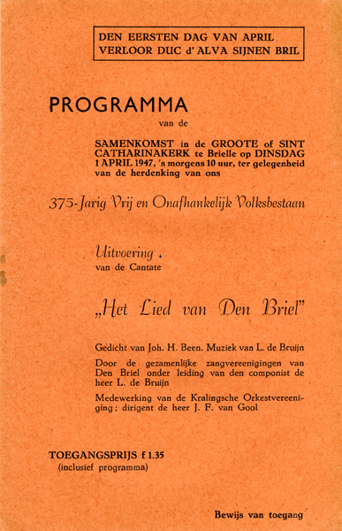 Programma van de samenkomst in de grote of Sint Catharijnekerk te Brielle op dinsdag 1 april 1947, ter gelegenheid van de herdenking van ons 375-jarig vrij en onafhankelijk volksbestaan. Uitvoering van de Cantate en met o.a. een gedicht van Johan. H. Been.