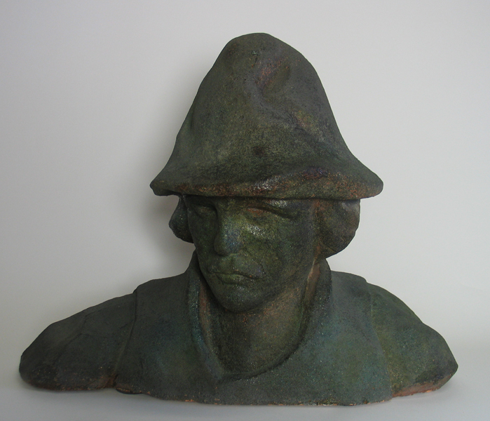 Afgietsel zijnde een proefafgietsel van klei van het hoofd van veerman Coppelstock. Man met hoed op en kijkt half gedraaid naar rechts.