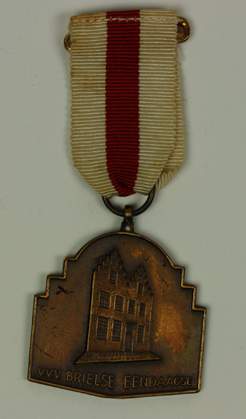 Medaille, wandelmedaille aan wit-rood-wit lint met speld. Op de voorzijde een afbeelding van twee huizen met trapgevels, waaronder tekst: 'V.V.V. BRIELSE EENDAAGSE.