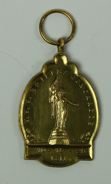 Medaille, wandelmedaille met oog, goudkleurig met op de voorzijde een afbeelding van de nimf en tekst: 'V.V.V. BRIELSE EENDAAGSE 10-15-25 K.M'.