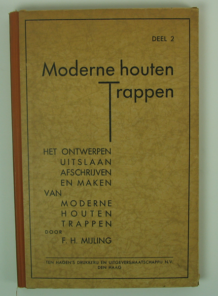 Boek, getiteld: Moderne houten trappen, het ontwerpen uitslaan afschrijven en maken van moderne houten trappen. Deel 2. Geschreven door F.J. Mijling. Boek, bruin/beige kaft met op voorkaft opschrift in zwarte letters.. Boek gebruikt door Servaas Middelhoek (1896-1966). Op eerste bladzijde bovenaan handgeschreven opschrift: 'S. Middelhoek/ A'dam.'