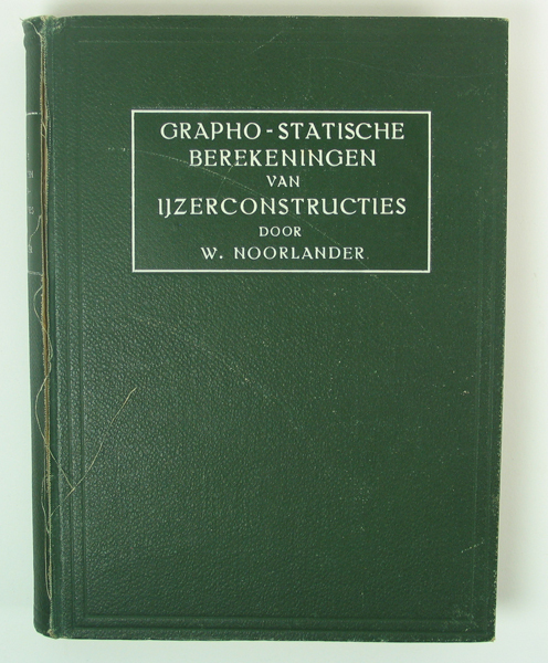 Boek, getiteld: 'Grapho-statische berekeningen van ijzerconstructies', geschreven door W. Noorlander. Boek, groene kaft met op de voorkaft en rug opschrift in witte letters. Boek gebruikt door Servaas Middelhoek (1896-1966).