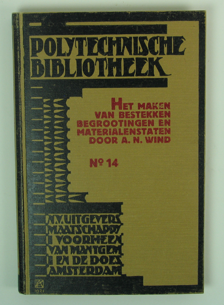 Boek, getiteld: 'Het maken van bestekken begrootingen en materialenstaten', geschreven door A.N. Wind. Boek heeft een bruin/beige kaft, voorkaft en rug voorzien van opschrift in zwarte en rode letters. Boek gebruikt door Servaas Middelhoek (1896-1966).