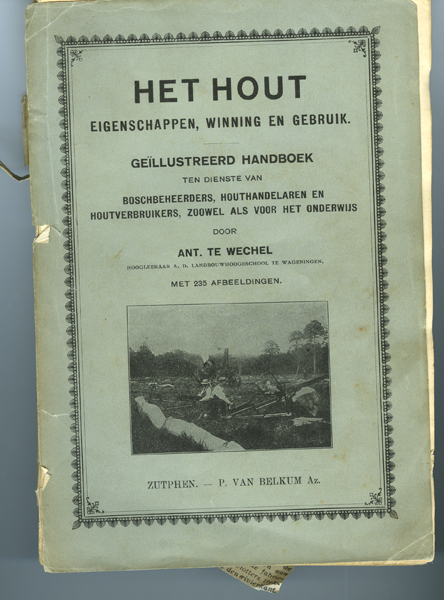 Boek, getiteld: 'Het hout, eigenschappen, winning en gebruik', geschreven door Ant. Te Wechel. Boek met grijs/blauw kaft met op voorkaft een zwart/wit afbeelding en opschrift in zwarte letters. In boek een krantenknipsel, zie reproducties. Boek gebruikt door Servaas Middelhoek (1896-1966).