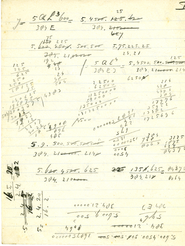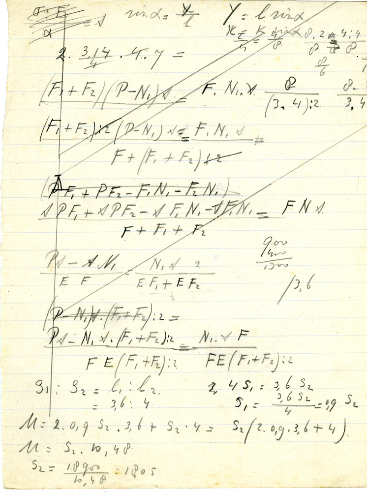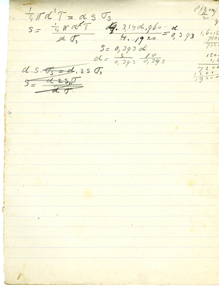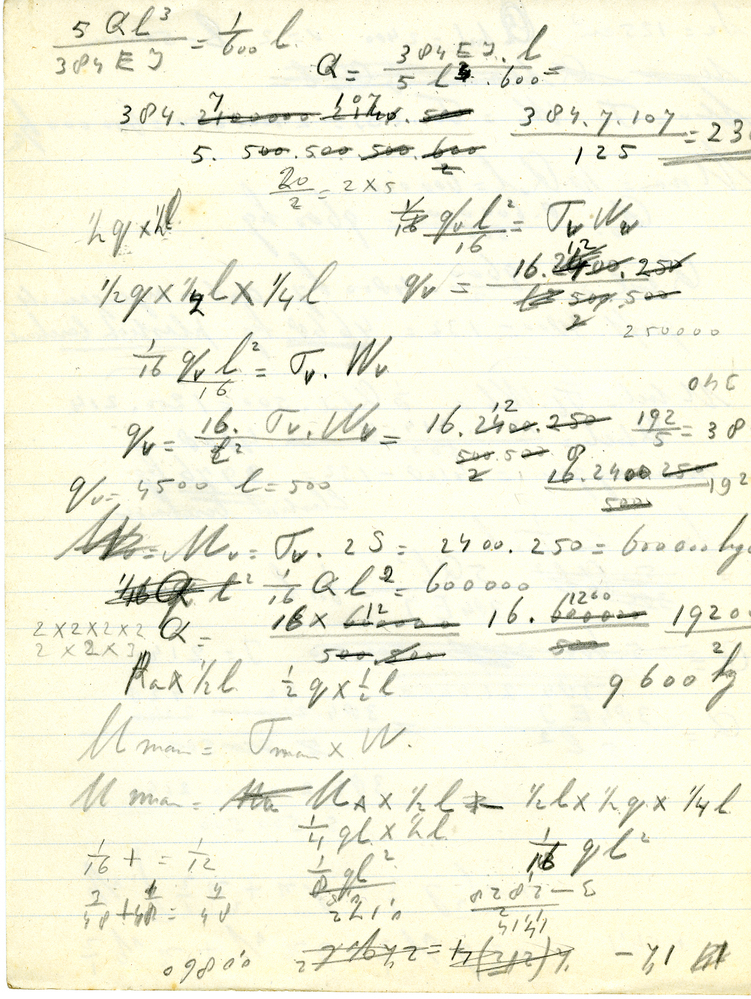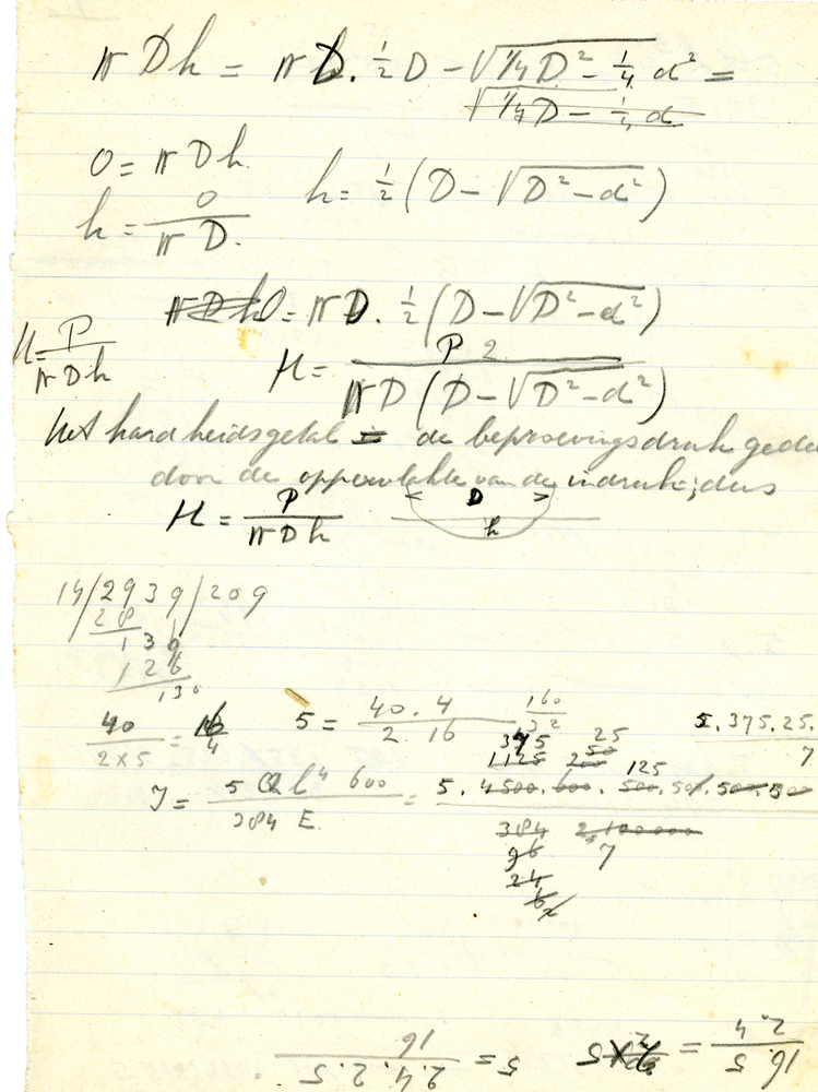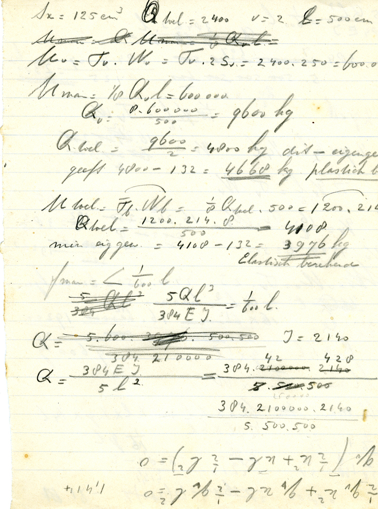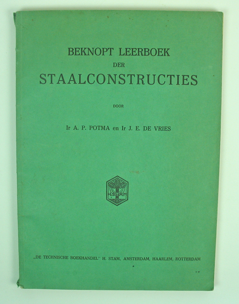 Boek, getiteld: 'Beknopt leerboek der staalconstructies', geschreven door Ir. A.P. Potma en Ir. J. E. de Vries. Boek met groene kaft en op rug en voorkaft opschrift in zwarte letters. In boek vijf kladblaadjes gevonden met berekeningen, zie reproducties. Boek gebruikt door Servaas Middelhoek (1896-1966).