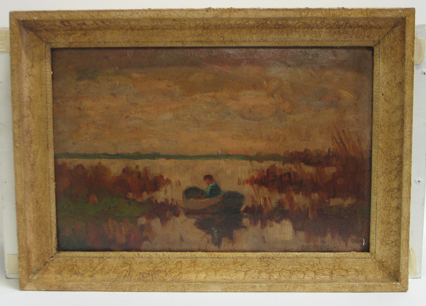 Schilderij, olieverf op board, met gezicht op een meer, onder een bewolkte lucht. Op de voorgrond een man in een boot nabij de oever en riet. Gesigneerd rechtsonder.