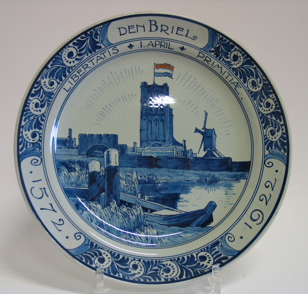 Delftsblauw bord, met gezicht op Brielle met de St. Catharijnekerk, de molen en een poort. De rand is versierd met een bloemmotief.