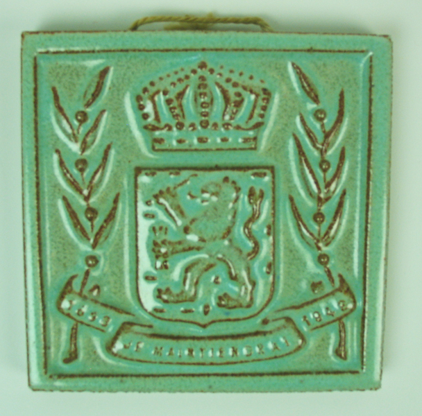 Gedenktegel 'koninklijk huis' 1648-1948', mintgroen, met in het midden het wapen van het koninklijk huis met aan weerzijden twee olfijftakken. Onder het wapen een banderol met opschrift: '1648 JE MAINTIENDRAI 1948'. Aan bovenrand voorzien van een touwtje op tegel mee op te hangen.