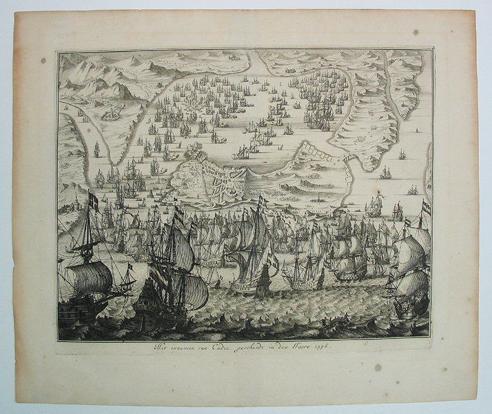 Prent, ets, met voorstelling van de inname van Cadix in 1596. Nederlaag van de Spaanse vloot toegebracht door de Engelse en Nederlandse vloten bij Cadiz, 1 juli 1596. Plattegrond van de baai met in het midden de stad Cadiz gelegen op het Spaanse schiereiland. Op de voorgrond de zeeslag. Onder voorstelling opschrift.