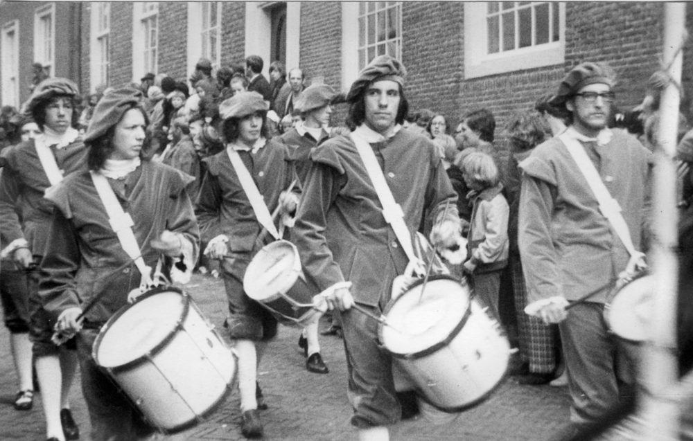 Foto, zwart/wit, gemaakt tijdens de 1 aprilviering van 1972. Op de foto een groep trommelaars.