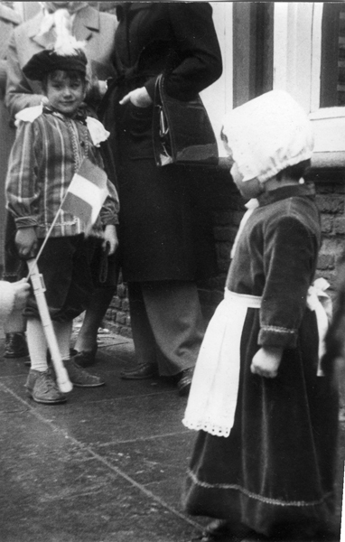 Foto, zwart/wit, gemaakt tijdens de 1 aprilviering van 1972. Op de foto een verkleed jongentje en meisje.