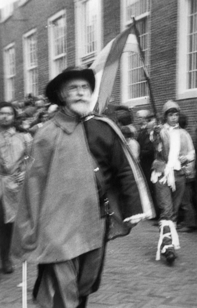 Foto, zwart/wit, gemaakt tijdens de 1 aprilviering van 1972. Geuzen wandelend door de Koopmanstraat.