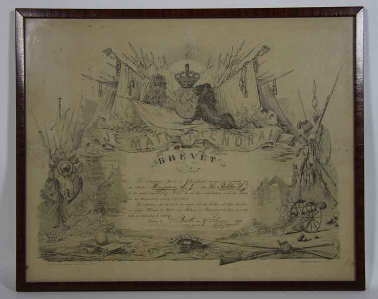 Prent in mahoniehouten lijst. Boven het midden het rijks wapen met kroon, omgeven door vaandels en twee leeuwen. Aan de linkerzijde eikenbladeren, aan de rechterzijde laurierbladeren. Rondom de tekst militaire symboliek. Aan de achterzijde een koperdraad tussen twee oogjes.