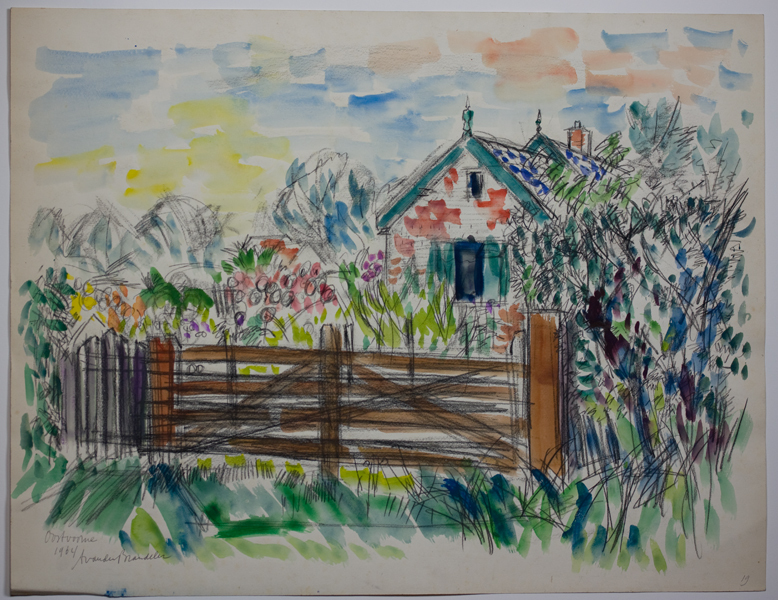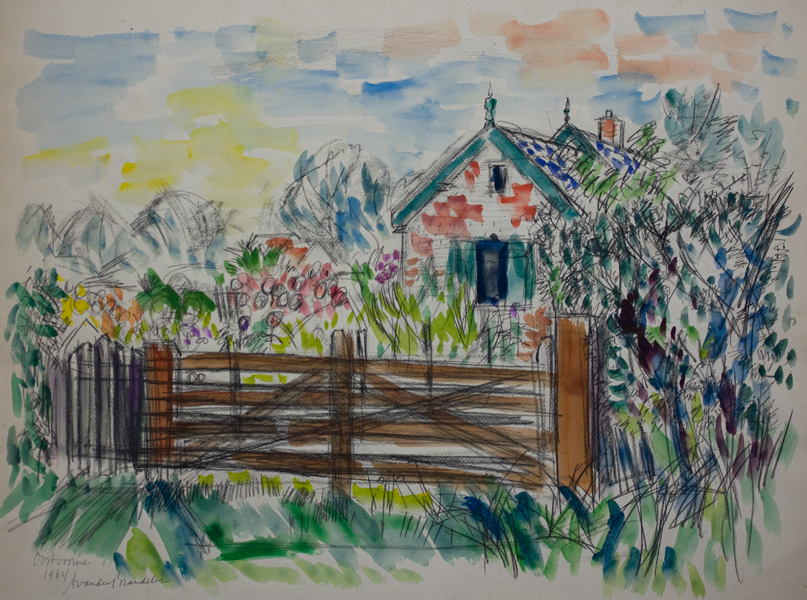 Aquarel/krijttekening van boerderij met op de voorgrond een tuin of boomgaard en een hek. Veelkleurig. In de linker onder hoek signatuur.