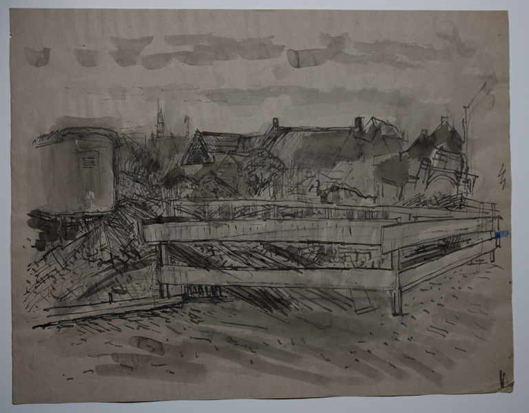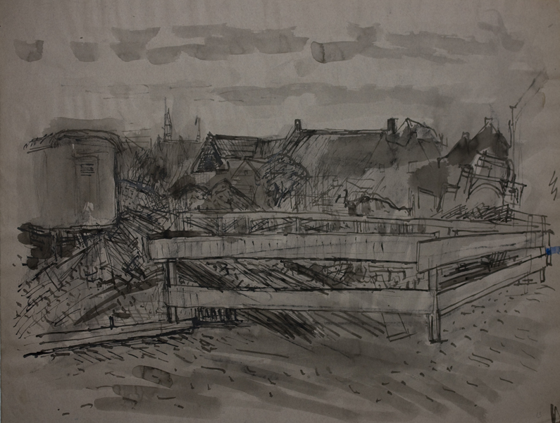 Inkttekening van een bouwterrein. Op de voorgrond een afrastering. Links in beeld een bouwkeet. Op de achtergrond huizen, vermoedelijk Brielle.