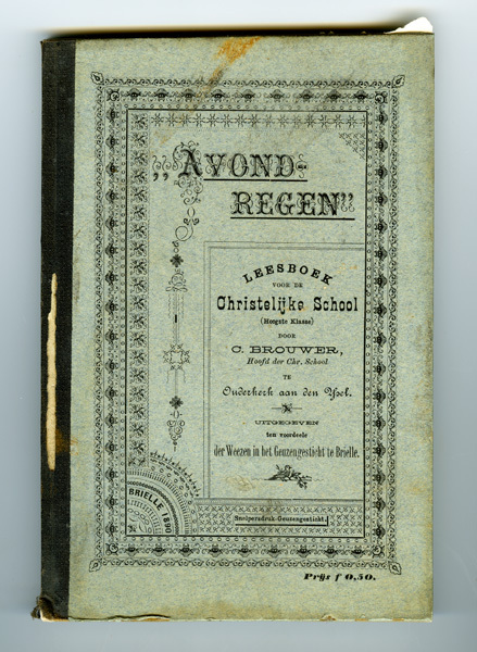 Boek, getiteld: 'Avond-regen', leesboek voor de Christelijke school. Uitgegeven voor de wezen in het Geuzengesticht te Brielle.
