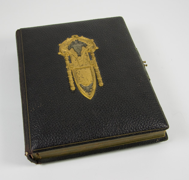 Fotoalbum met zwart leren kaft. Op de voorzijde een metalen ornament. Aan de binnenzijde zit een gebloemd stofje geplakt. Dikke kartonnen pagina's met uitsparingen voor de foto's. Portretten in zwartwit van mannen, vrouwen en kinderen. Rond de uitsparingen een gouden bies. Klep van sluiting ontbreekt.